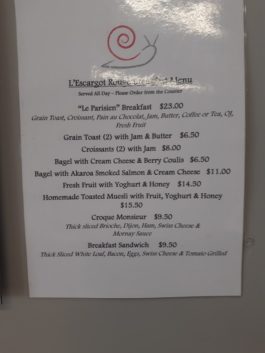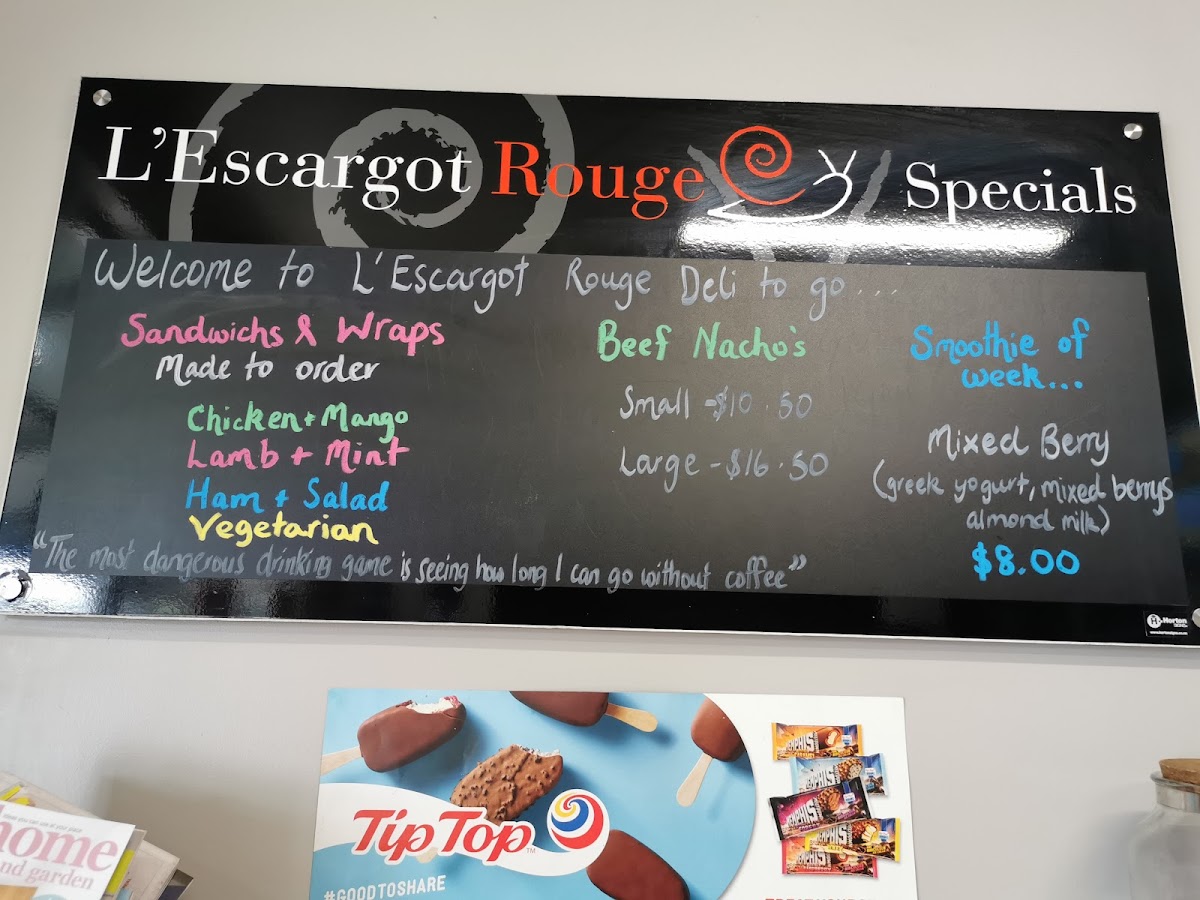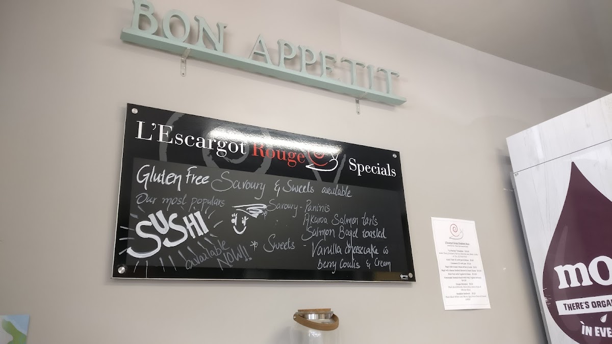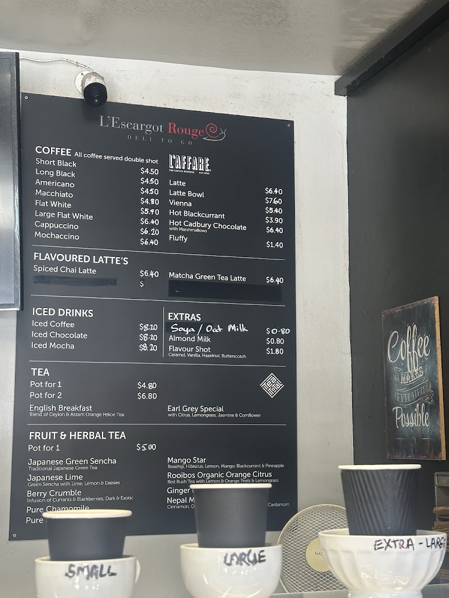 Overall, the beverage menu at L’escargot Rouge offers a simple yet satisfying range of options, covering both classic café staples and a few more distinctive choices. Coffee lovers can rely on familiar picks like Short Black, Long Black, Americano, Macchiato, and Flat White, while those seeking something more indulgent may enjoy the Spiced Chai Latte or Matcha Green Tea Latte from the flavoured selection. The iced section, featuring Iced Coffee, Iced Chocolate, and Iced Mocha, provides refreshing alternatives, especially suited to warmer days. Tea drinkers are also well catered for, with traditional options such as English Breakfast and Earl Grey Special, alongside a diverse fruit and herbal range including Japanese Green Sencha, Japanese Lime, Berry Crumble, Pure Chamomile, and Mango Star. Additional comforts like Latte, Latte Bowl, Vienna, Hot Blackcurrant, and Hot Cadbury Chocolate round out the menu, while extras like Soya and Almond Milk allow for customization. Though prices are not specified, the selection reflects a cozy, café-style offering that complements the restaurant’s relaxed and inviting atmosphere.